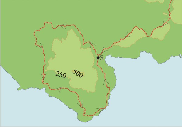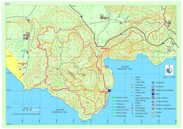 İslamlar (podamya) yerleşiminden 1 km kadar güney yönde asfalt yol üzerinde ilerleyen yol Akbele ulaşır. Akbelde mezarlıktan sağa; camiye doğru giderken ilk aradan sola, sonraki ilk aradandan sağa sapıp okulun yanındaki yoldan düz ilerleyen patika , Antalya asfaltından hemen karşıya geçince delikkemer tabelası çıkar. Akbelden bu noktaya kadar asfalt yolda ilerleyen yol, sonrasında çalılık içerisinden 6 km boyunca Kınık-patara ovasını seyrederek ilerler. Delikkemere varılınca yol ikiye ayrılır. Biri Kalkana dogru giderken, diğeri Patarayadogrudelikkemere paralel bir şekilde ilerler. Kemerin yanından geçip Patara tabelası görülür. Sol taraftaki toprak yolda Likya yol işaretleri yer yer silinmiştir. Sol tarafında Fırnazkoyu ve Kalkan manzarası görülür. 2-3 km düz gittikten sonra yol yokuş aşagızigzaklar çizerek ilerler ve sonunda Pınarkürüne varılır. Burada yaz kış faal bir çeşme bulunur. Kalkan açıklarındaki adalarının manzarası eşliğinde inişli çıkışlı yol, çam ve yer yer zeytin ağaçları altında ilerleyerek Patara kumsalını gören bir tepeden aşağı doğru birkaç km inen yolda Patara tabelası görülür. Sol taraf, Patara ve Gelemiş yerleşimine, sağ taraf ise bahçe ve dere yatağından yukarı çıkarak , 10 km lik toprak bir yoldan çam ormanı içerisinde tekrar Delikkemere ulaşır.